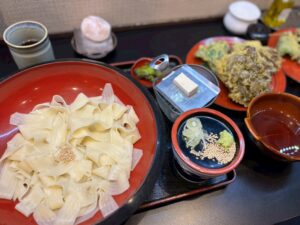 結局食べ足らず、群馬名物のひもかわうどんと地元新潟の黒舞茸の天ぷらをいただきました。